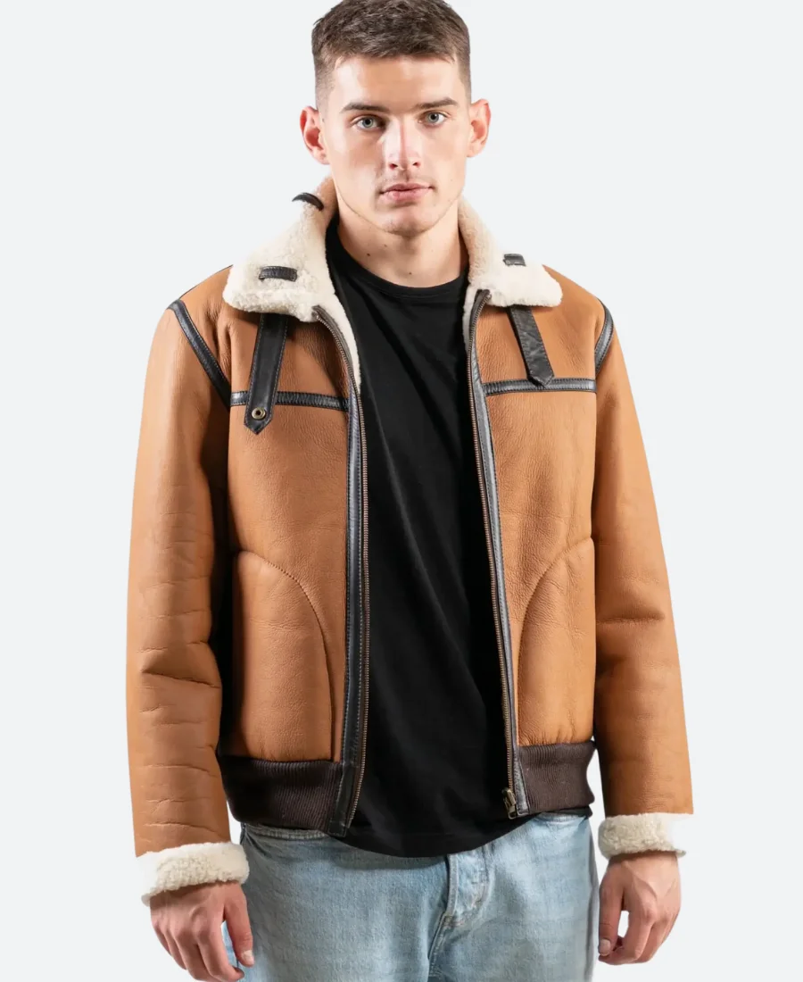 Mens Classsic Tan Brown Leather Shearling Aviator Jacket